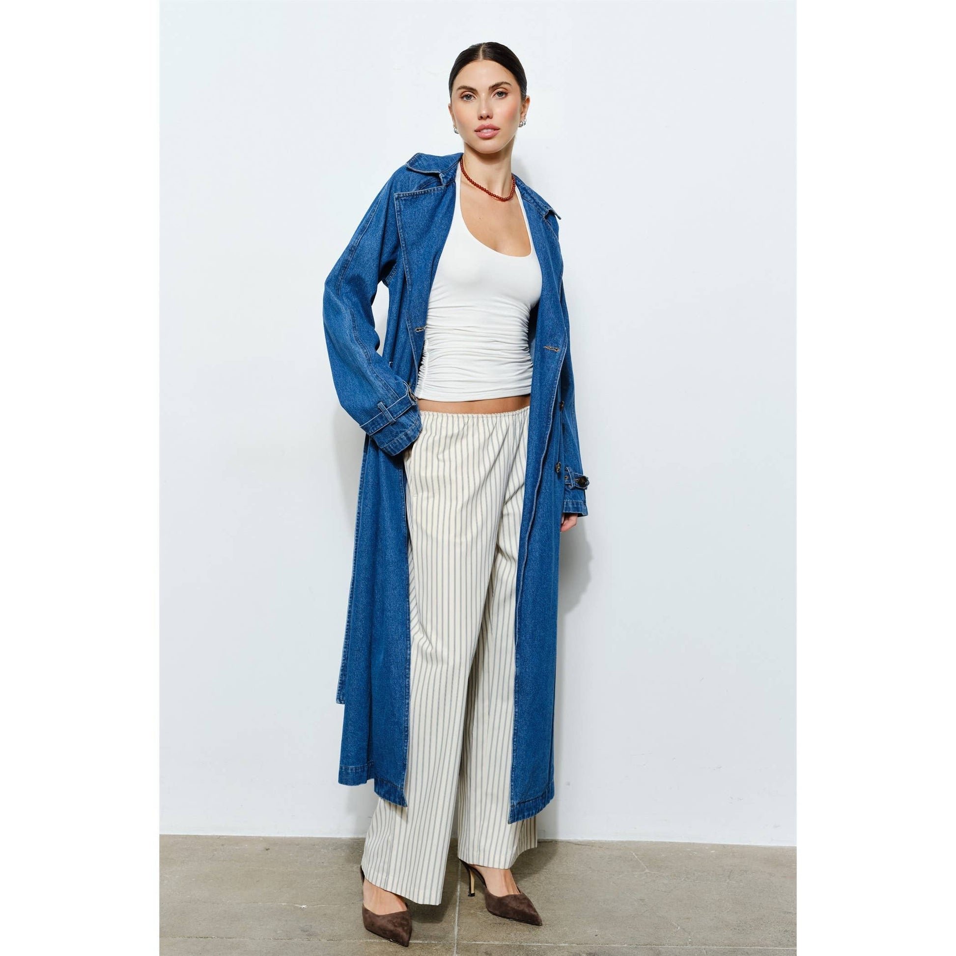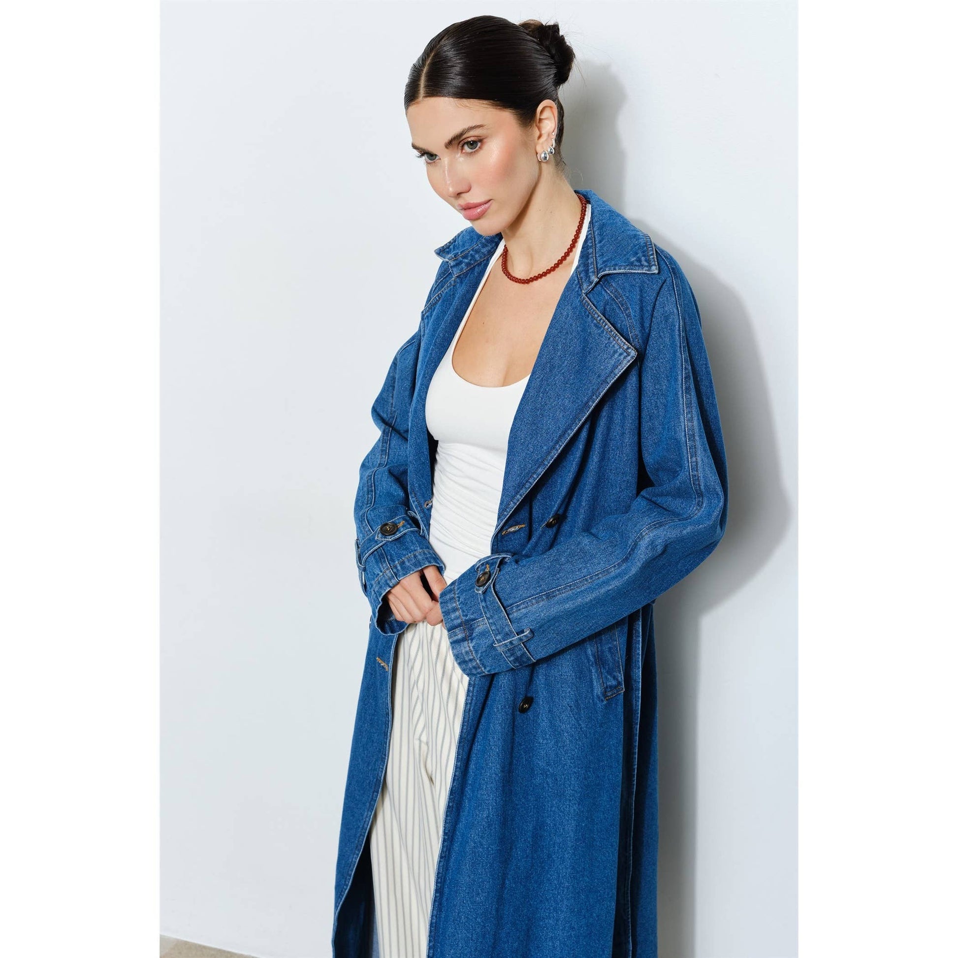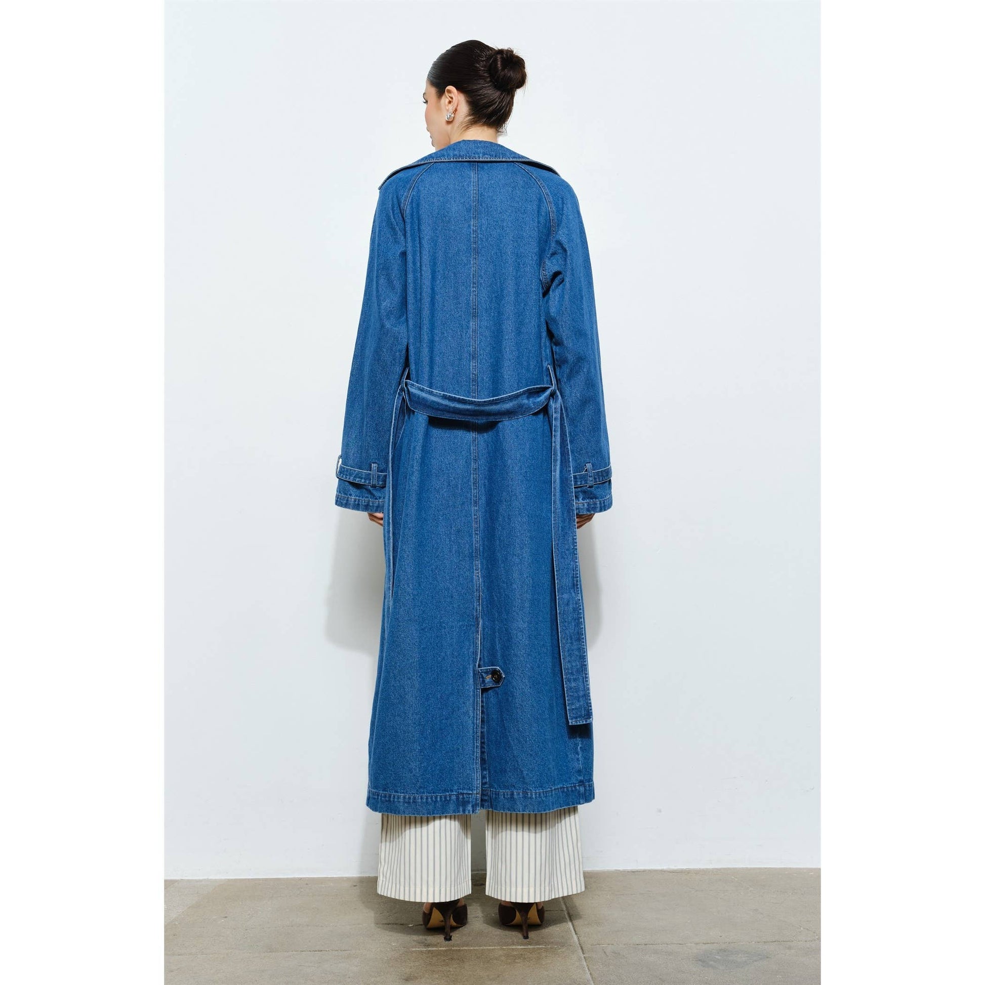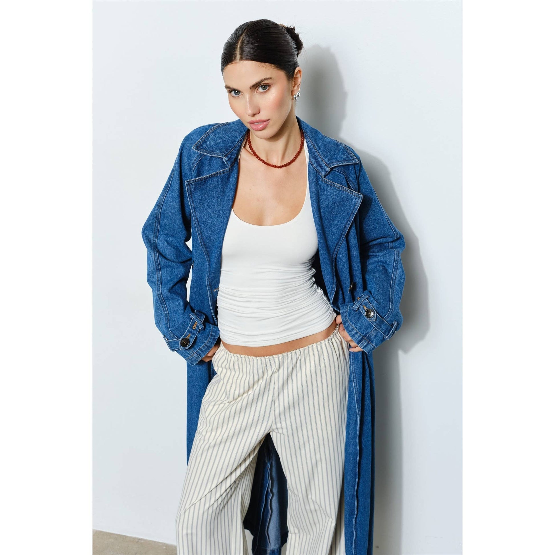 A timeless outerwear silhouette gets a modern update in classic blue denim. The Blakely trench features all the iconic details, including a double-breasted front and wide notched lapels. Use the matching self-tie belt to cinch the waist or wear it open for an effortlessly cool look.