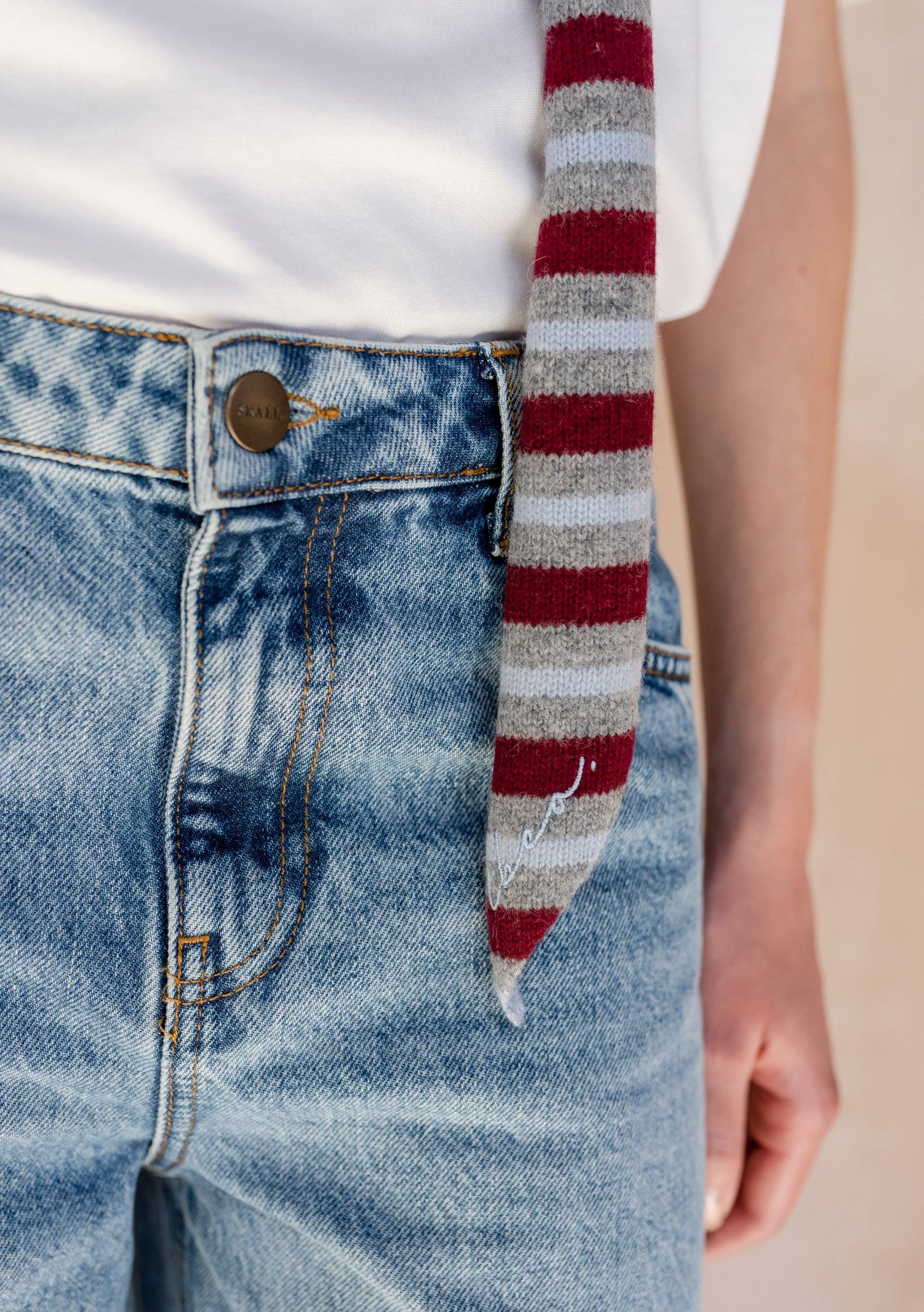 In a season of layering, the smallest pieces can make the biggest entrance. Inspired by vintage showmanship and made from buttery-soft merino wool, this TBCo neck tie in a burgundy, grey and light blue stripe is a playful twist on tradition. Lightweight and breathable, it’s perfect for the season shift – the kind of scarf you forget you’re wearing, until someone compliments you on it.
