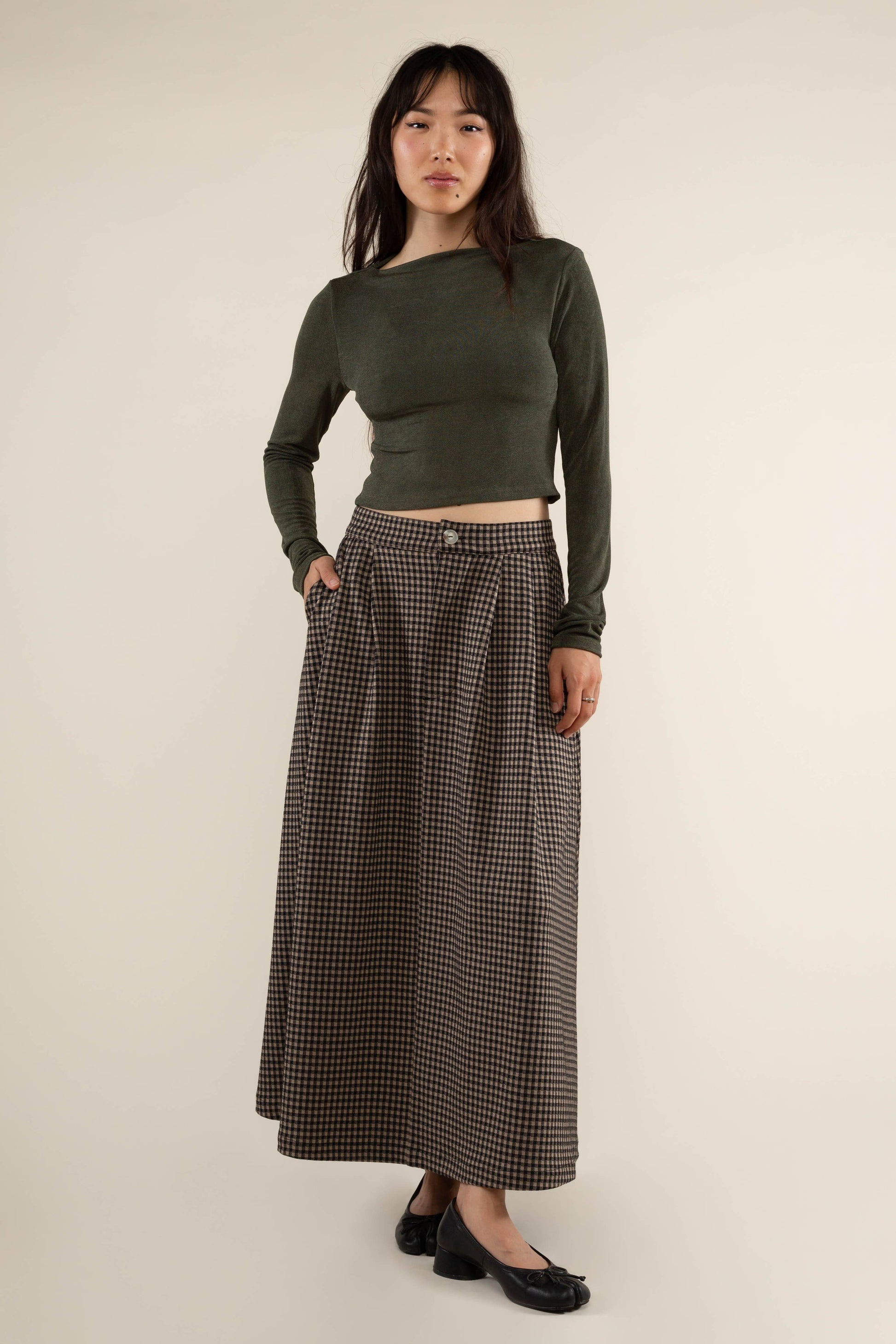 Maxi skirt with zipper and button closure at front. The skirt is a a-line shape with pleats at the front and side pockets.