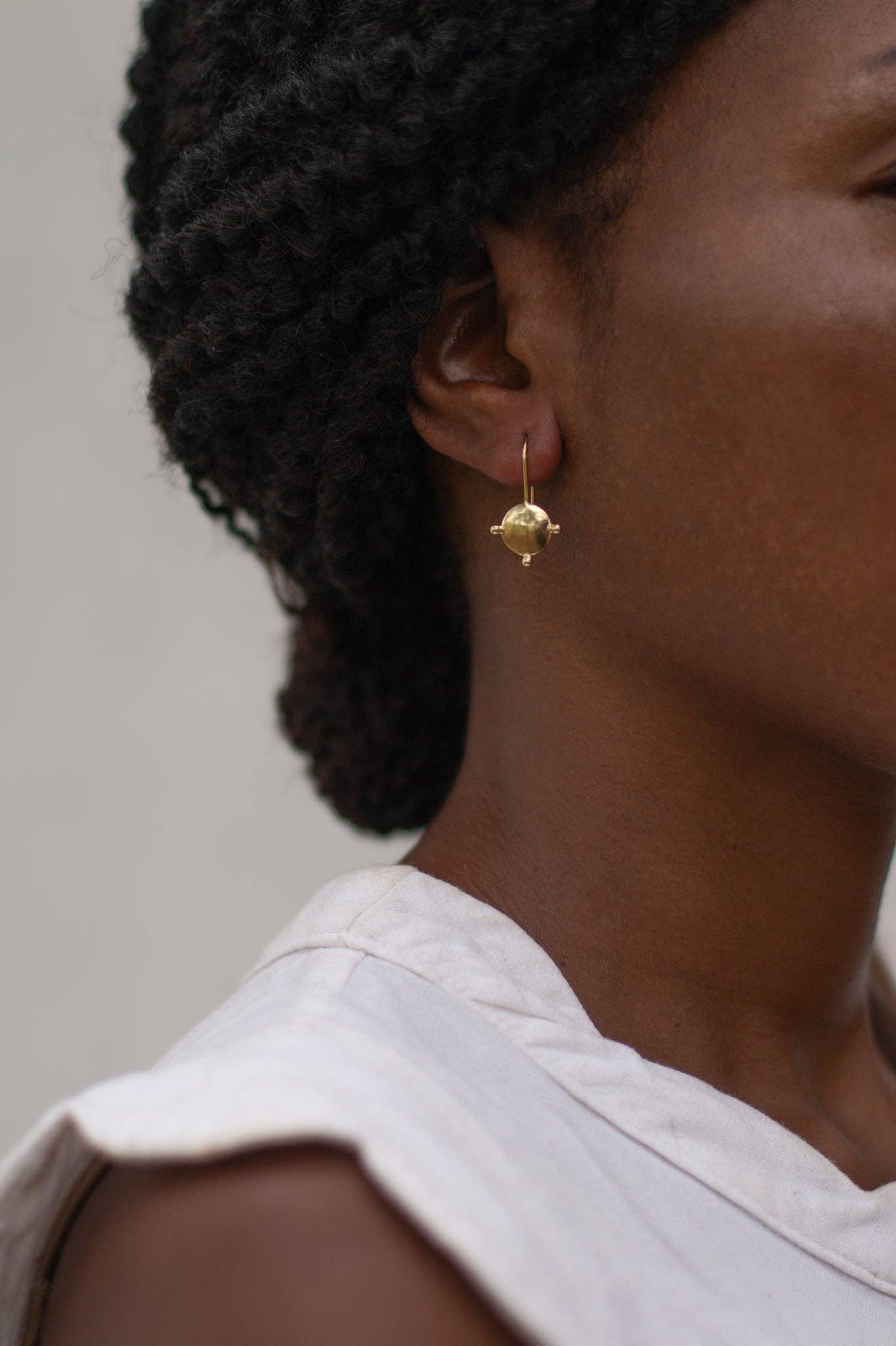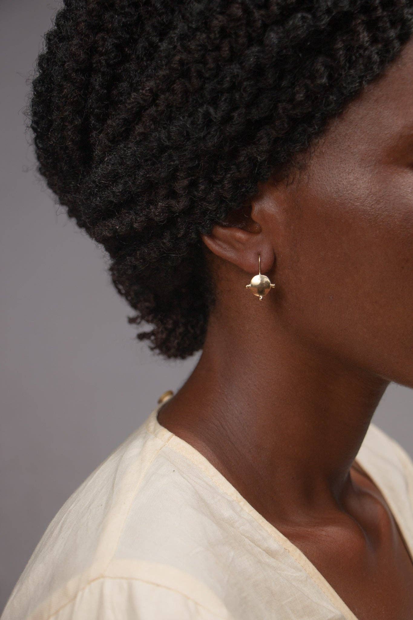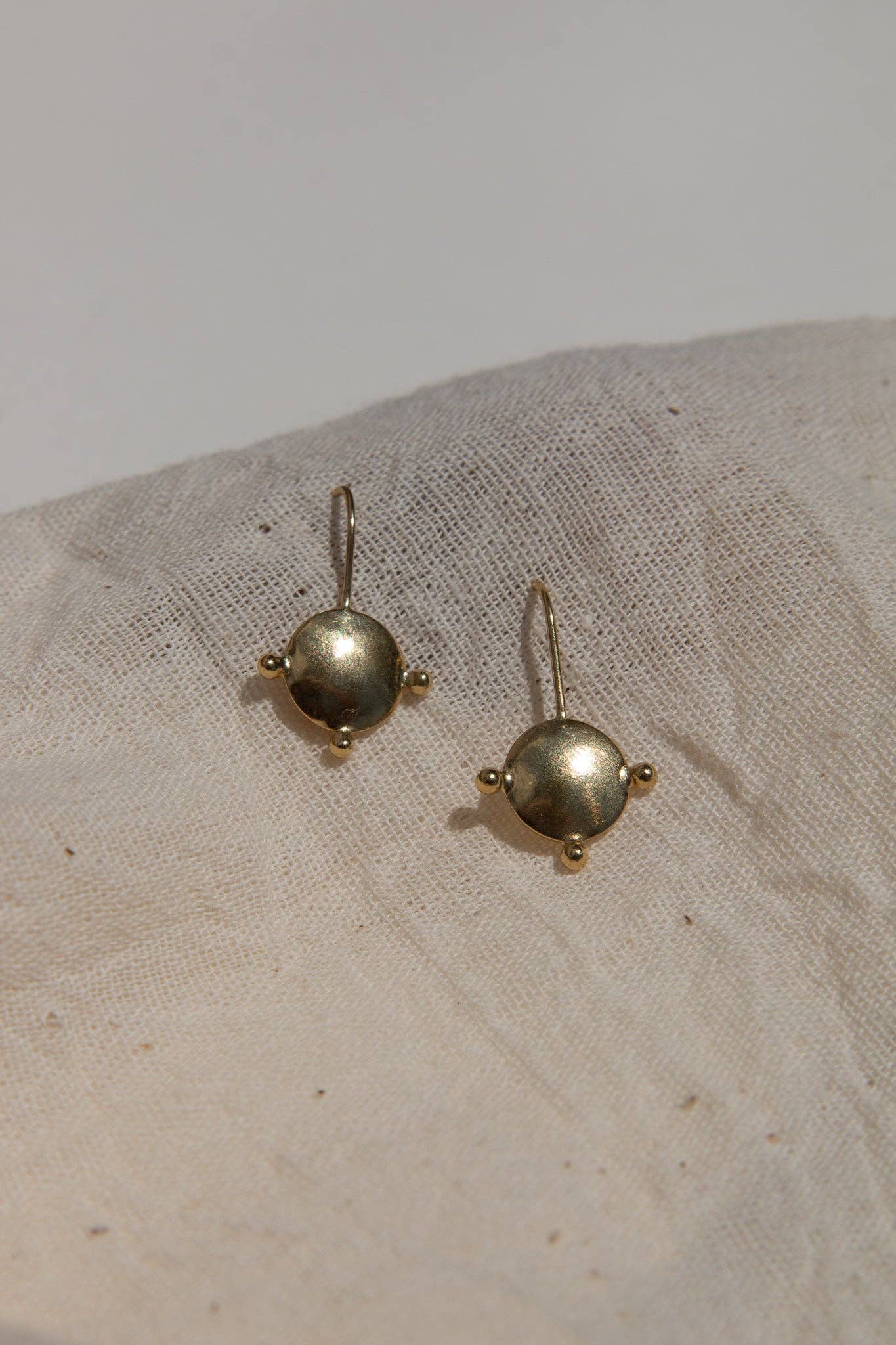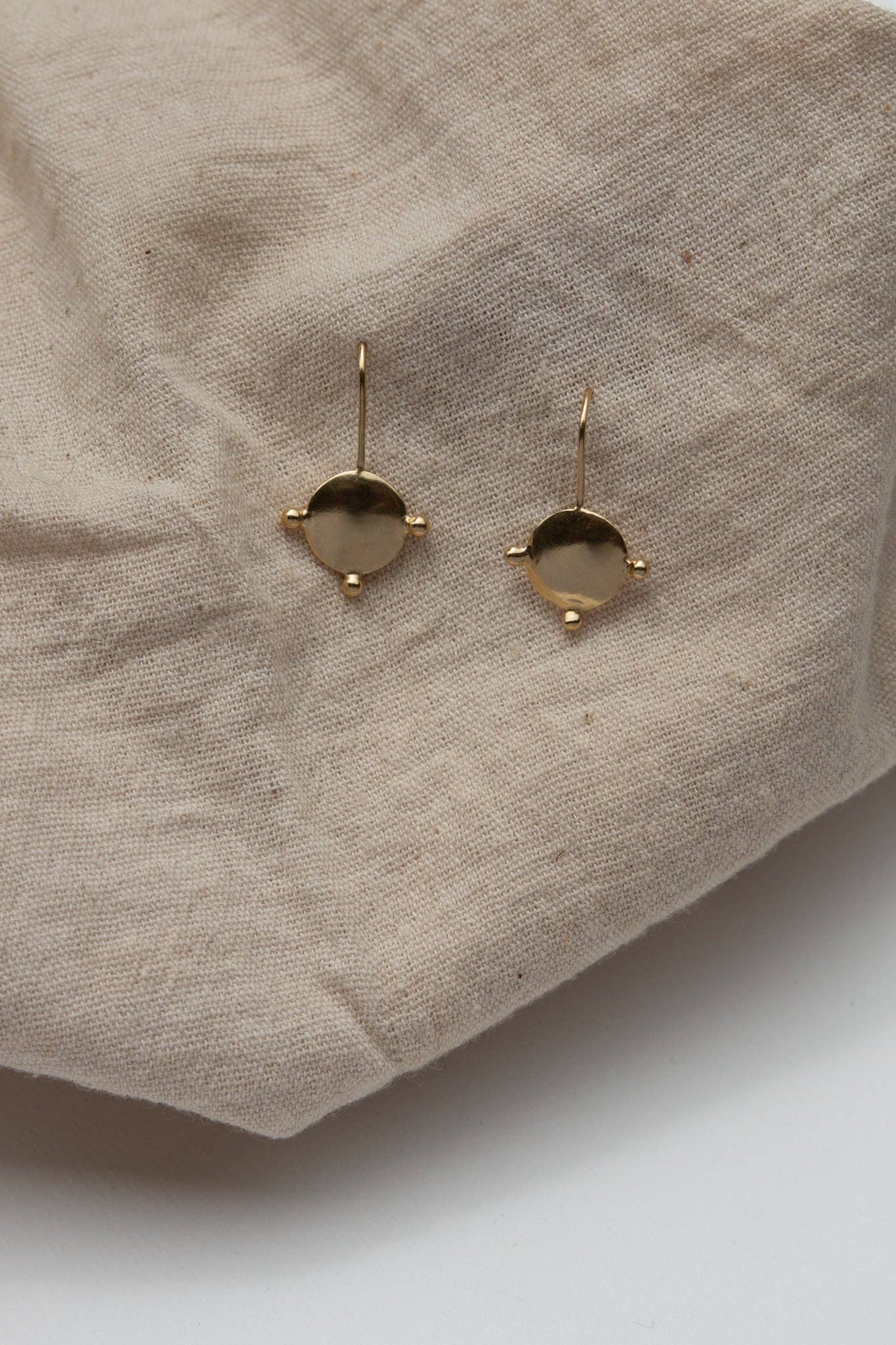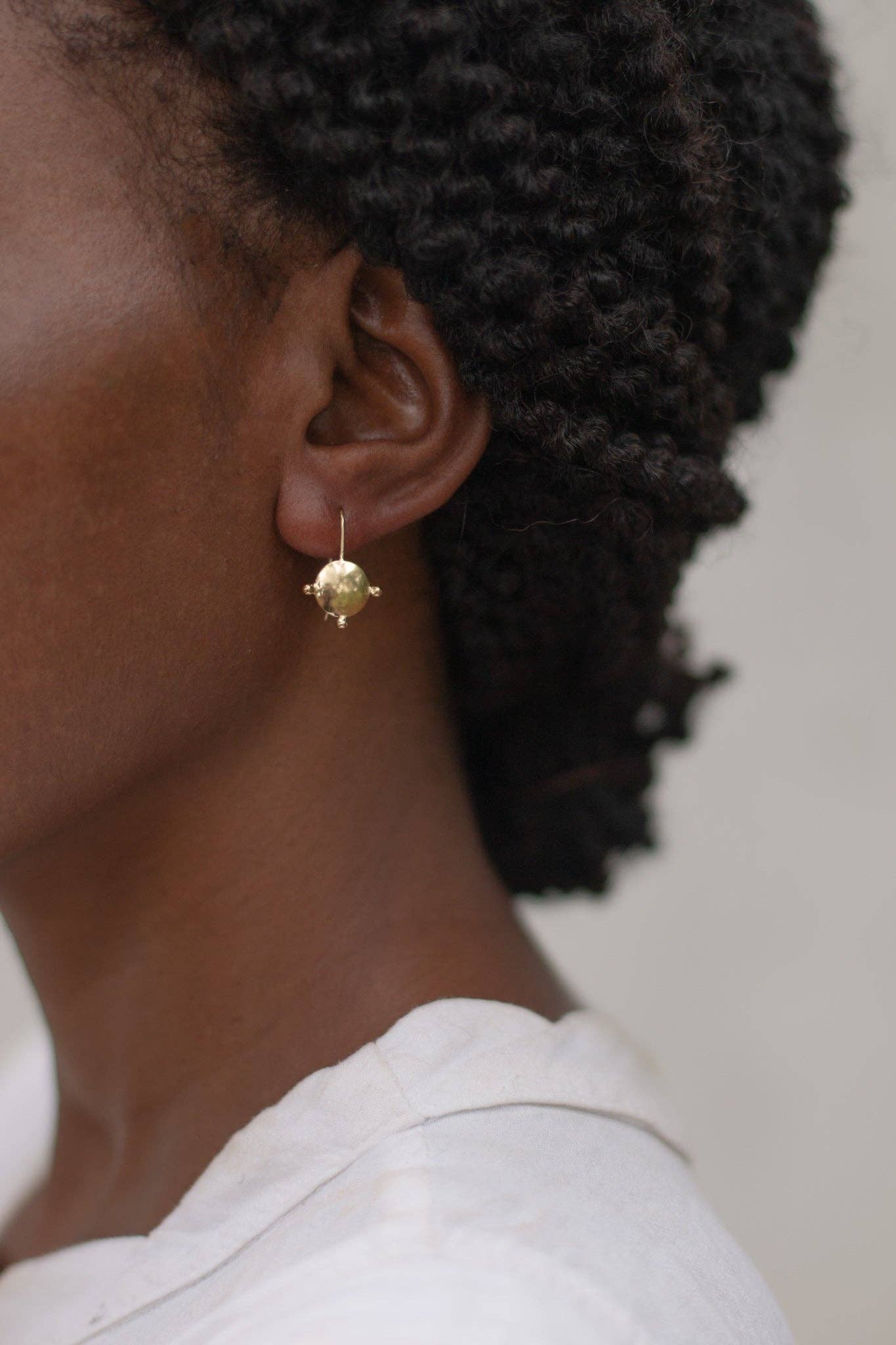 The 'Tatu' Earrings (meaning 'Three' in Tumbuka) are based on ancient West African design with a hand-formed organic circular shape and three individual balls. Crafted from brass coated in a luxuriously thick layer of 14k recycled gold, the classic Tatu Earrings add a touch of feminine flare to your everyday.